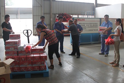 公司領(lǐng)導(dǎo)還驅(qū)車20多公里,前往練塘工場(chǎng),向避雷器車間、電線車間、三箱車間,鐵殼車間的一線員工送上防暑用品。